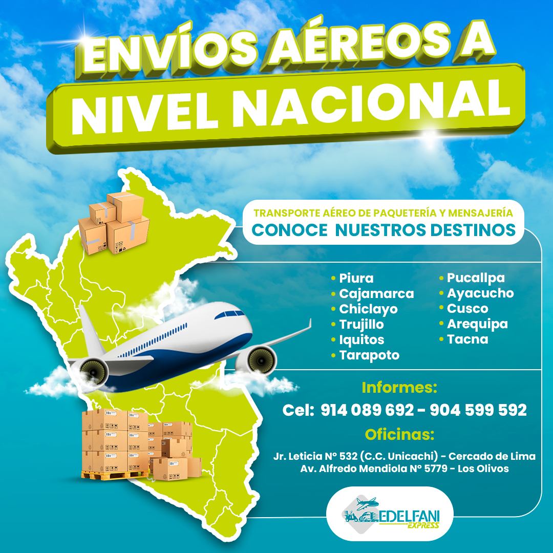 Nos moldeamos a las exigencias del mercado peruano, desde el año 2,018 nace EDELFANI Express una opción de servicio de mensajería, transporte de carga (terrestre y aéreo) y logística de almacenamiento de mercadería, cumpliendo con el proceso de recojo y entrega de puerta a puerta a nivel nacional dentro del plazo requerido por nuestros clientes. Tenemos convenios para garantizar una amplia red de agencias y seguimiento del servicio de transporte en todo el país.