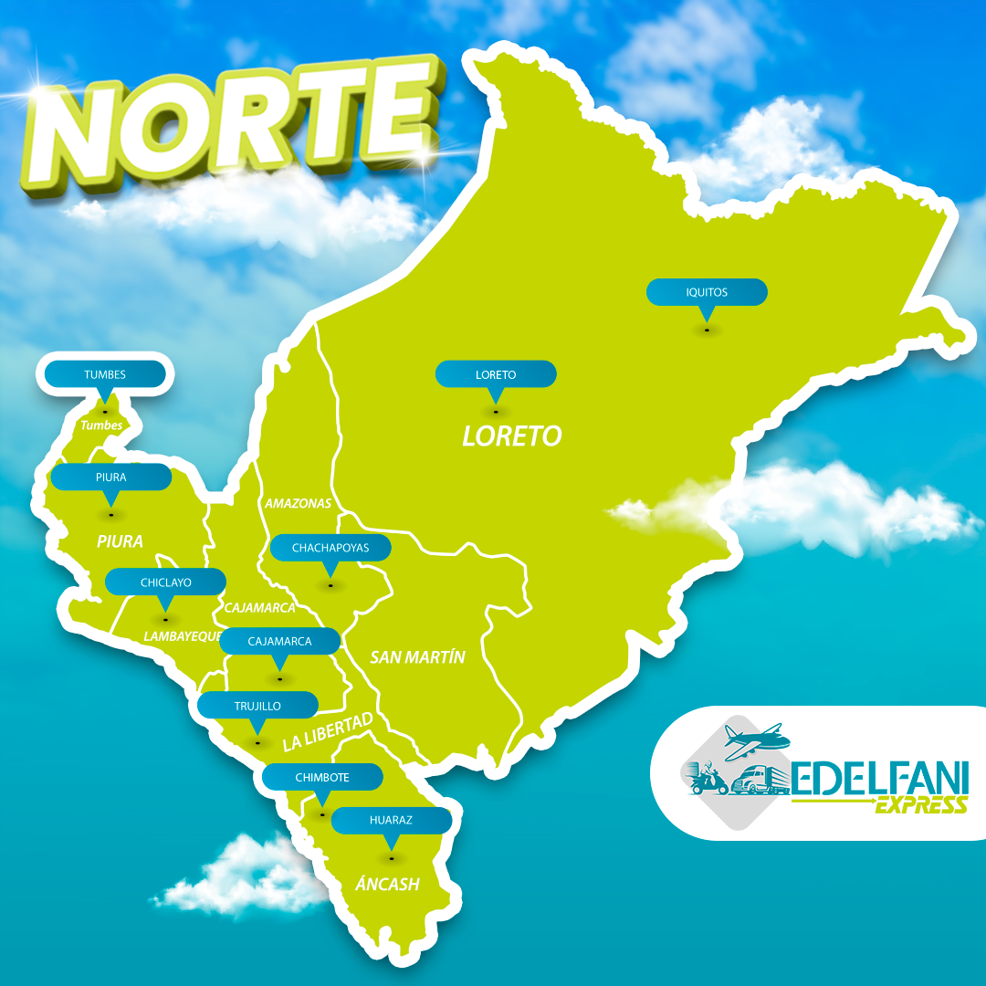 Tumbes, Piura, Chiclayo, Chachapoyas, Cajamarca, Trujillo, Chimbote, Huaraz, Loreto, Iquitos